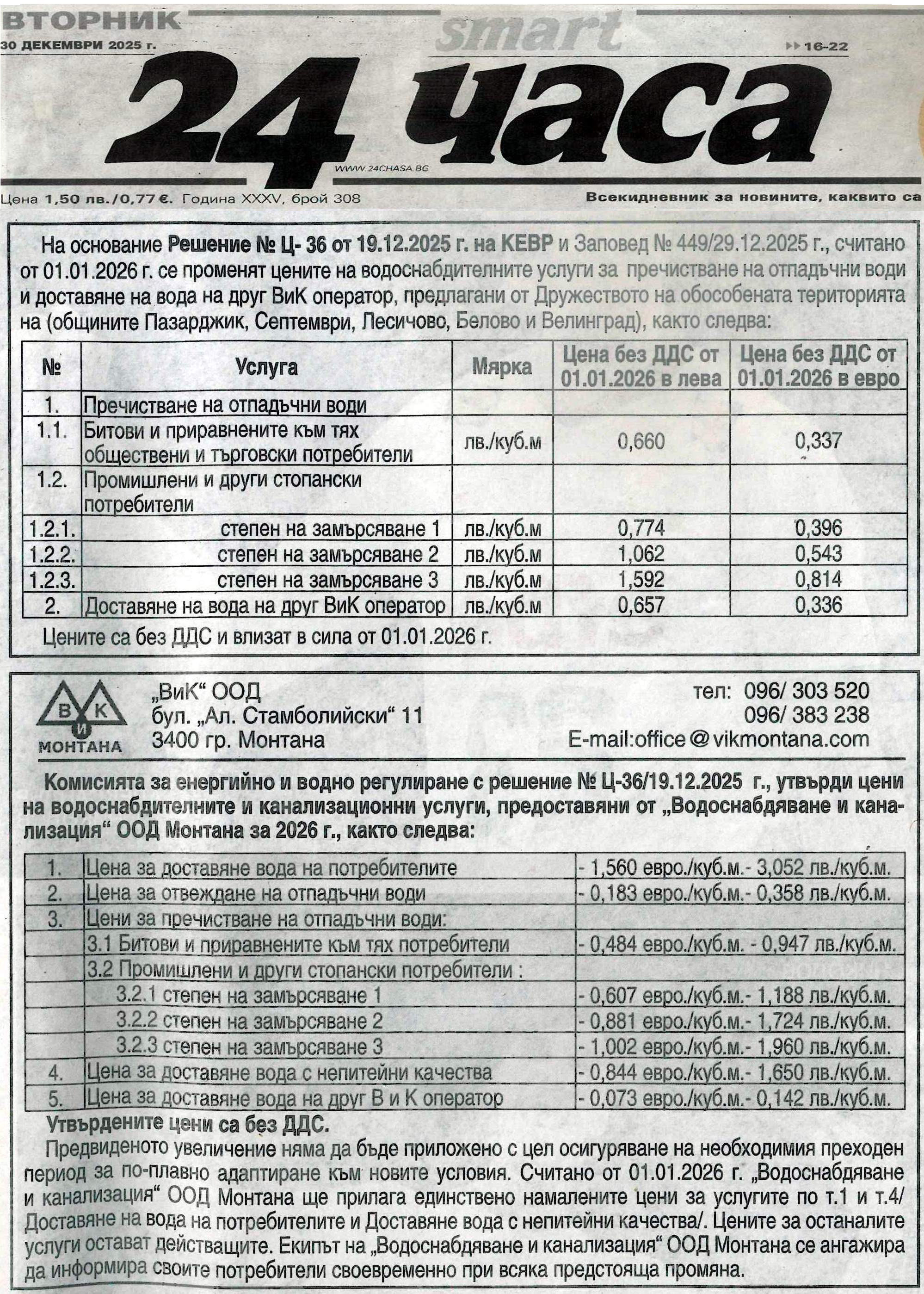 Комисията за енергийно и водно регулиране с решение № Ц-36/19.12.2025 г., утвърди цени на водоснабдителните и канализационни услуги, предоставяни от „Водоснабдяване и канализация” ООД Монтана за 2026 г., както следва: